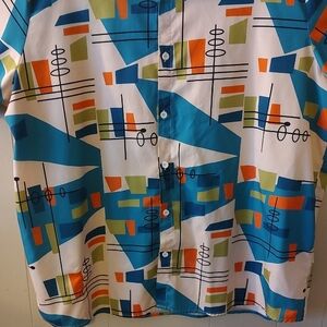Stand out with this vibrant retro geometric men's shirt, featuring a mix of blue, orange, and green patterns. 3XL Perfect for adding a pop of color and fun to your wardrobe. Polyester. 26" pit to pit. Straight hem. The very top button is missing and not noticeable when wearing. There is a flaw in the material on one sleeve (see last two pics) but this shirt is so cool it won't matter!