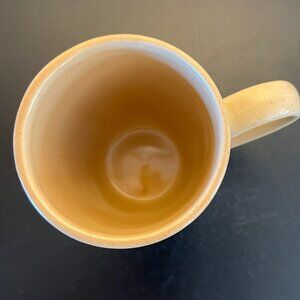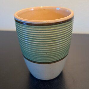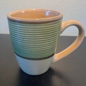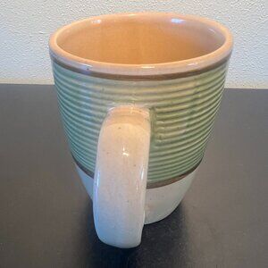 Everyday Gibson Designs stoneware mug in Retreat Green pattern. Classic retro designed tan glazed mug overlaid with green glazed vertical embossed ribbed ring section flanked by upper and lower brown rings. Comfortable heavyweight stoneware, like quality coffee mugs of days past. This pattern was produced from 2005 - 2009. Dishwasher, microwave and oven safe. Measures 4.25” tall with a 3.5” diameter; 5.25” across including handle. Holds 12 fluid oz.