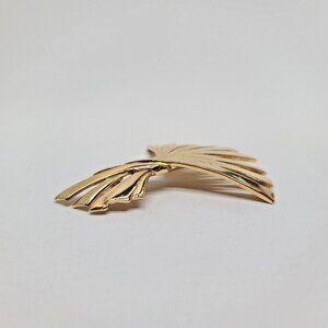 Givenchy, vintage brooch, gold-tone pin, abstract fan design, collectible jewelry, mid-century modern, modernist style, geometric pin, statement jewelry, designer brooch, fan motif, textured jewelry, 1980s brooch, bold accessory, luxury fashion, unique pin, high-polished finish, retro jewelry, authentic Givenchy, elegant brooch.