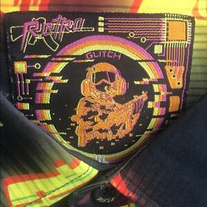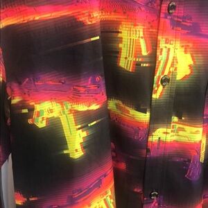 Bold shirt with a vibrant retro glitch graphic. Features striking colors for a standout look.