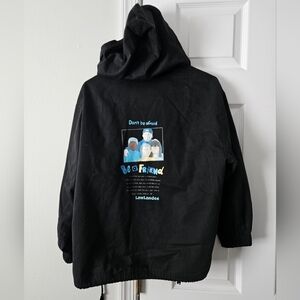 Chinese brand LawLandee jacket with a cute graphic on the back. Fits an xs/sm. For reference I'm usually a medium and the sleeves are just a tiny bit too short for me (would fit a petite medium). From a smoke free home, not written with AI! :)
