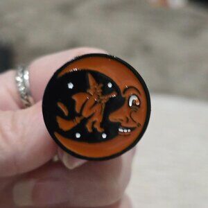 Step into moonlit nostalgia with this Retro Halloween Enamel Pin, featuring a silhouette witch riding across a crescent moon—pure flying broomstick fantasy.