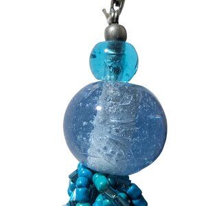 Elegant beaded necklace featuring intricate turquoise and blue beads with glass accents. Secure silver chain clasp. Measures 10 inches long.