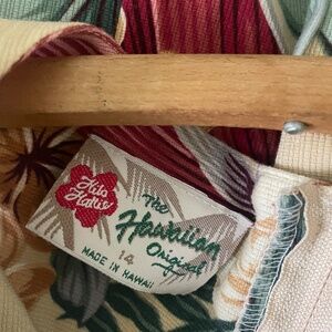 This Hawaiian floral retro mermaid cut dress in size 14 is a cool addition to anybody’s closet. The fabric is heavier , and seems to have a bark cloth pattern, however, it is not as heavy as bark cloth. This dress is in great condition for its age and has white contrasting trim around the bottom it zips in the back and please remember that true retro sizes run smaller.