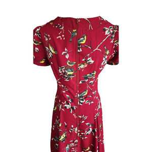 Beautiful 1940's retro style dress featuring yellow, black and white birds on branches with pink flowers. False collar with gold coloured buttons. Gathered into underbust seam. Sleeves with cuff at the hem. Pleats under the bust to the waist and at the back to shape. Featuring a zip in the centre back seam. This dress is unlined.