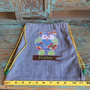 Homemade Denim Daypack Owl embroidered Debbie Personalized. Button eyes. Patchwork.