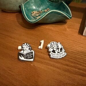 Set of retro-style stickers with humorous phrases. Perfect for adding a fun touch to your items. One enamel pin and two make it yourself pins