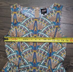 Vibrant dress with a geometric pattern. Features a mix of blue, orange, and cream colors. Perfect for a stylish look.