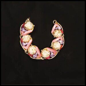 Wear some collage art on your wrist and be the only one to own this one of a kind vintage assemblage bracelet. Could it be perfect to go with a certain dress or outfit? It's unique, made with small / tiny recycled vintage pieces. All of the stones you see here were "floor sweepings" from an old jewelry factory. The interesting shapes are all old Lucite thermoset (moonglow) in pink and lavender. Base was once a vintage necklace or bracelet and it's slinky! The round cabochons are opaque white porcelain with gold "Florentine" finish. 7" long and that includes the foldover clasp (closed). It's eco-friendly, all recycled and for those who like having what no one else can have!
