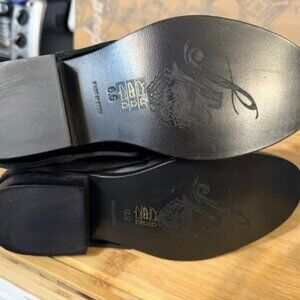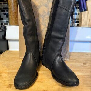 Tall style, pull-on design, dipped toplines, suede accents, folder-over construction, round toe, flat sole, stud details, soft, pre-distressed leather for a lived-in feel