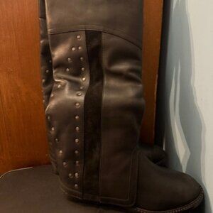 Bring the edge with these pull-on tall boots, featured in a smooth, distressed leather with an overlay shaft and studded details.