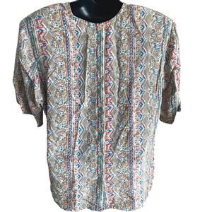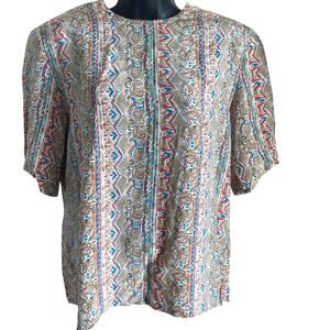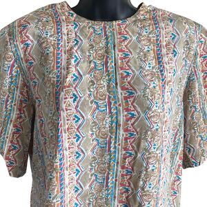 Retro Luxe Boho Silk Blouse 14 Tribal Floral Print Shoulder Pads Barrie Pace
