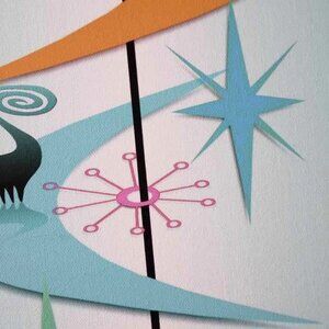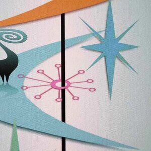 This piece was created for Cat Lovers and people who love the MCM Style of designing. It is a Giclee Print done in MCM colors and retro flourishes such as boomerangs, stars and atomic imagery. It is printed onto canvas and is presented in a wrap-around where the canvas actually does wrap around the frame. It can be displayed without a frame or in a floating frame.