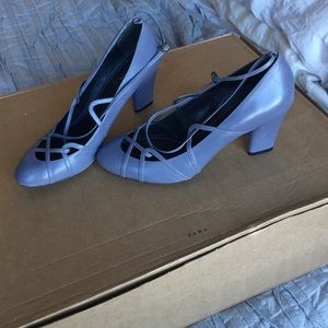 Strappy pump with retro 3 1/4" chunky heel. Barely worn; color is a Greyish purple.