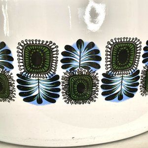 Very good condition medium-sized Mid-Century Modern (60s-70s) cooking pot with lid and handles. This stockpot is white enamel with a starburst style flower or peacock motif printed on both sides. Would make a wonderful housewarming gift or holiday hostess gift filled with a pot luck dish.