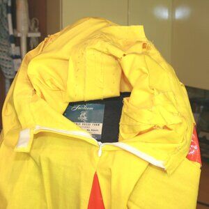 This is a great mini skirt. It has a vintage feel and look but may be made more recently. It is a linen like material with a vinyl or pleather inserts. The side has a zipper and Velcro closure. The vinyl seems like it was added over the base material. I think it was homemade but done well, maybe for a theater group. No size tags but it is about 21 1/2 inches long and 14 1/2 inches wide flat at the waist. There is some stains and what looks like duct tape issues on some of the inserts. Great for the retro look, myself I see it being worn at the antique car show.