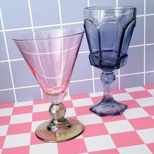 Looking for some wonky, wonderful, retro-fabulous wine glasses? You found 'em! Not a wine-o? Your Sparkling water, iced espresso, or daily OJ would love to be fancy, too! One of these vessels (the martini glass) is perfectl post-modern from the late 80s/early '90s. The blue is from back in the '70s. Your eyes are NOT deceiving you, the stem of the blue glass is indeed "bent". This is a factory defect that I could not pass up. I waited ages to find another single glass to pair it with....and along came funky, opalescent post-modern martini! Aren't they the cutest duo? Grab em! They are truly one of a kind.