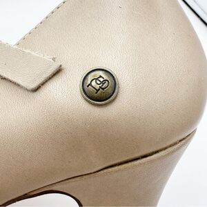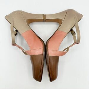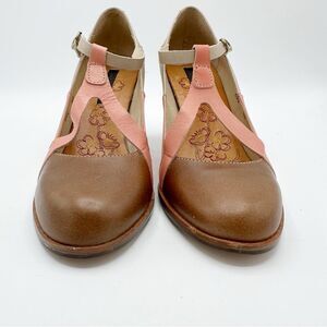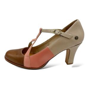 Vintage bohemian style in a brand new modified t-strap pump in taupe, pink and brown smooth leather. Adds a sweet retro vibe to work office career or casual. Buckle closure.