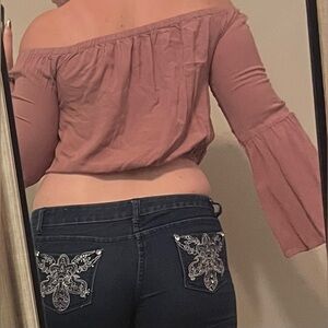 This off-shoulder top features a pink lace and flare sleeves. The intricate detailing adds a touch of sophistication to your wardrobe.