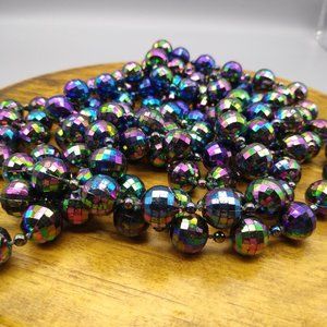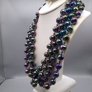 Retro Oil Slick Beads Necklace, Black Plastic Long Strand with Glossy AB Finish, Vintage Disco Faceted Statement
