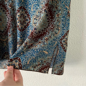 • features retro paisley blouse with wrap layered fabric neckline at bust. V-neck, and short sleeve. Lightweight fabric. Side cut detail. Pit to pit approx 23” with additional stretch available, front length 28”, back length 30”
