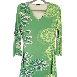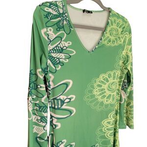 Fun and comfy! Very stretchy, vibrant green tunic that can be worn as a mini dress depending on body type. Retro 60s vibes and flowy loose fit. Great over leggings or bike shorts too.