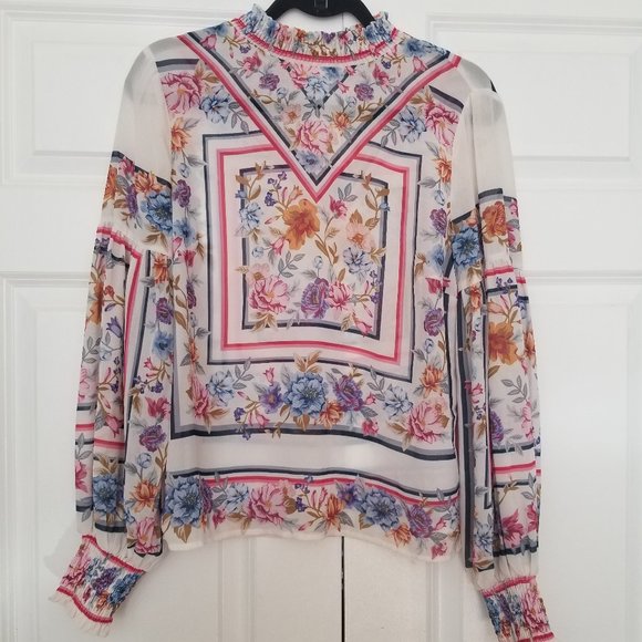 Patterned blouse. High neck detail with cinched sleeves. Floral pattern with a retro design. Extremely flattering, great condition.