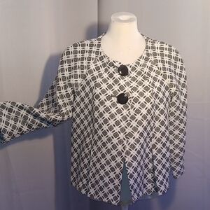 This vintage retro style swing jacket has a bold black and white design. Features large button accents. Ideal for stylish layering.
