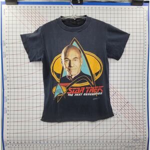 Bold fandom meets street style This vintage single-stitch tee from 1991 features Captain Picard’s unmistakable visage against a clean black backdrop—iconic and wearable. Pair with black leather jacket, cuffed denim, and sneakers to bring smart casual geek chic to life. Size L. Soft, pre-loved cotton feels broken in yet durable. No major flaws. Gently cherished in vintage-ready condition.