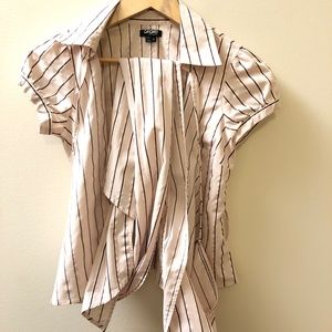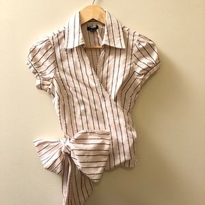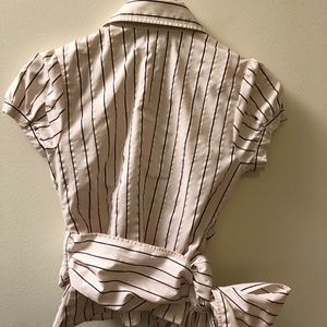 This pink and brown striped belted shirt will cinch your waist and accentuate your curves. Extra long ties attached to shirt allow you to fold a dramatic bow at the waist.