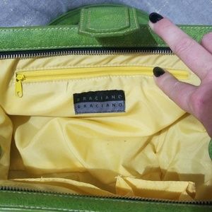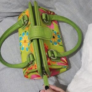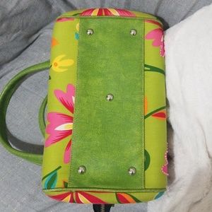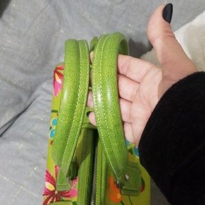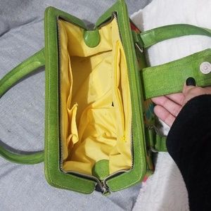 This is a rockin cute pinup style retro handbag. Bright green with fun colorful floral pattern, beaded accents on flowers in front, Green leather straps, leather bottom with feet, clam style closure with functional zipper and snap, inside pocket, some minor stains on inside liner. This handbag adds fun and flirty style to any outfit! Downsizing bag collection. 👉offers welcome 👈
