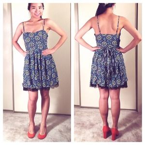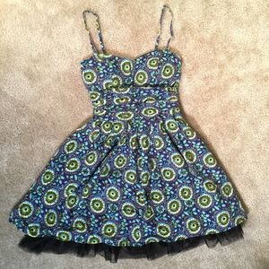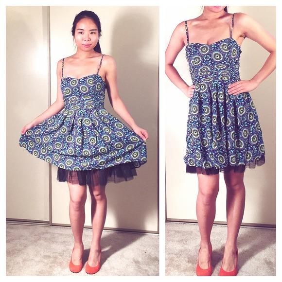 pinup / rockabilly chic!!! Cute dress with a Van Gogh-ish abstract floral print! Artsy and girly. Puff A-line silhouette. Great to pair with an open cardigan to show the sweetheart neckline. Waist tie. Adjustable strap. Fits like a XS, size 0. Pit2Pit 14". Length (exclud. strap) 27". Bottom lined with mesh.