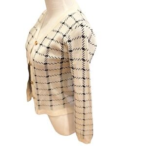 Retro Plaid Windowpane Cardigan Sweater Oatmeal Ivory Black XS S Preppy