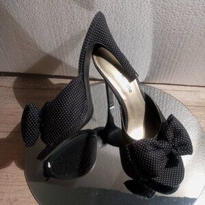 Nearly new. Black & White "Swiss-Dot" print fabric. Open toe with Feminine Bow accent. Apprx 3" Heel. Super comfy. Size 8M