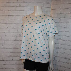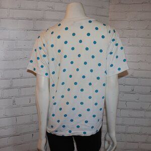 Great condition · 60% cotton / 40% poly blend White tee with blue polka dots · Front pocket detail Soft, breathable, and full of personality