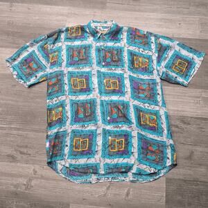 Retro Protest Abstract Design 100% Silk Multi Color Button Up Short Sleeve Shirt. Excellent preowned condition.