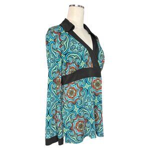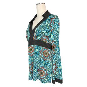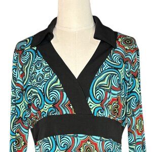 Bisou Bisou Retro Psychedelic Print Long Sleeve Top Women's Size Large Empire Waist Stretch Blouse Collar