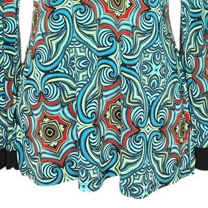 Stand out with this bold and vibrant retro-inspired top! Featuring a hypnotic psychedelic swirl pattern in teal, red, yellow, and black, this long sleeve blouse adds instant energy to your wardrobe. The flattering V-neckline, contrasting black trim, and empire waist give it a vintage-inspired silhouette that’s both chic and comfortable. Perfect for pairing with flared jeans, wide-leg trousers, or a mini skirt — ideal for concerts, casual outings, or 70s-inspired looks.