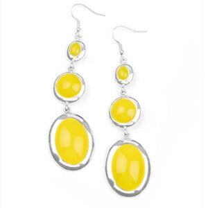 Mismatched glassy yellow beads are encased in sleek silver frames that whimsically link into a colorfully retro lure. Earring attaches to a standard fishhook fitting.