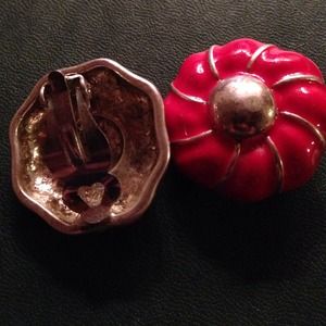 Super adorable retro red flower earrings. About the size of a quarter. Silver details.