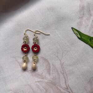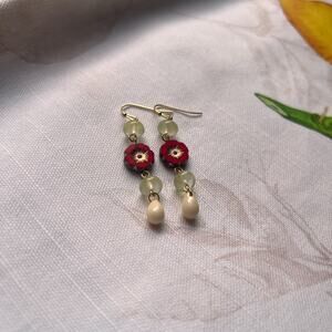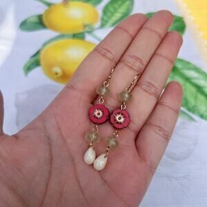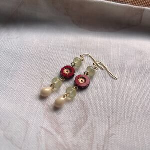 Retro Red Floral Flower Czech Glass Fruit Green Jade Beige Drop Fun Beaded Earrings