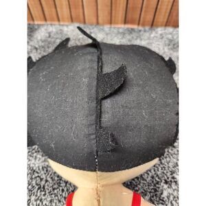 Pre-owned with some wear such as some of the red from her shirt has bled to her neck. Her hair has some stray strings on her hair. In gently used condition. No tears, or bad odors. Measures approximately 16 inches tall.