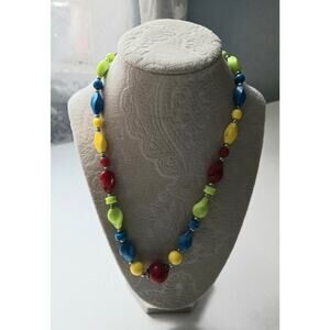 Retro Red, Yellow, Blue, and Yellow Plastic Beaded Necklace and Green Earrings