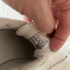 Women’s 6 white retro tennies with blue accents.