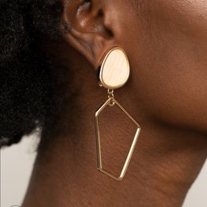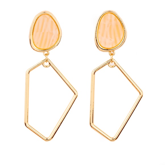 Encased in a classic gold fitting, an abstract faux stone fitting gives way to an airy geometric gold frame for a refined asymmetrical look. Earring attaches to a standard clip-on fitting.