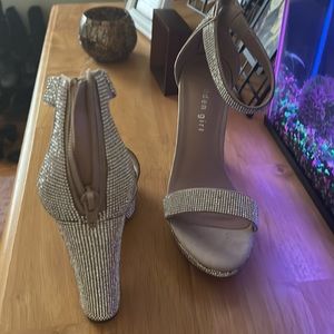 4 1/2” block heel and 1” platform, almond toe, rhinestone sandal. Never been warn outside. Worn once indoors.