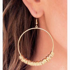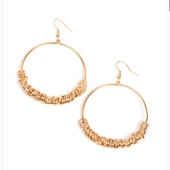 An abundance of miniature shiny gold rings slide around a simple gold front-facing hoop, resulting in a polished industrial vibe. Earring attaches to a standard fishhook fitting.