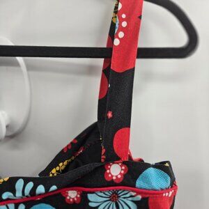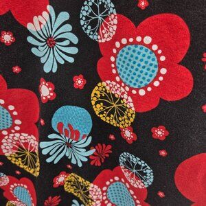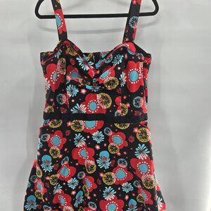 Source Unknown Retro 60s 70s Rockabilly Black w/Red Blue Flowers V-Neck Neckline Ft and Flare Large