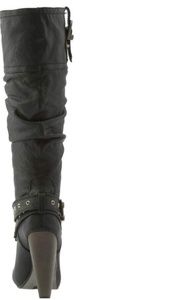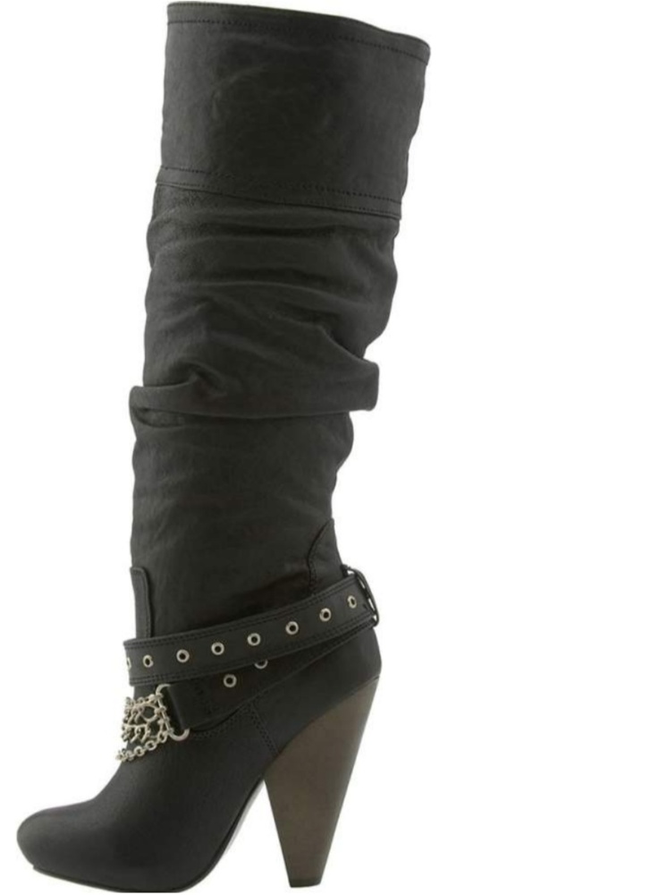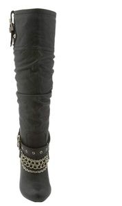 Luxurious, leather uppers and a ruched shaft · Strap and chain accents at the instep · Buckle and snaps at the collar · Pull-on construction · Slightly rounded toe · 3.5-inch tapered heel · 3/4-inch hidden platform · 14.5-inch shaft · 16-inch circumference · Soft fabric lining · Lightly cushioned footbed · Leather sole with logo
