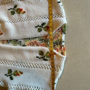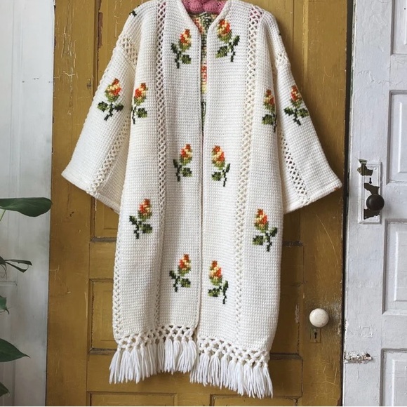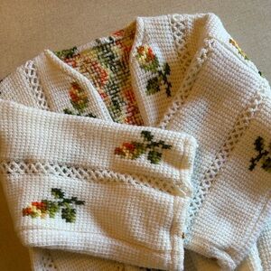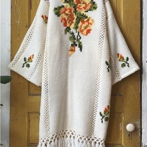 A very special, custom made sweater by For Emily Whenever. This is made from one or more secondhand/handmade afghans, likely vintage age, so there are flaws. All seams inside are raw and may require a trim after washing. FIT NOTES: These are designed to be boxy, slouchy, oversized, fits like a kimono so it should be loose. I generally recommend they be at least 6 inches bigger than your chest measures. It will be a closer fit on a bigger body and more oversized on a smaller body. Modeled on a 38-30-40" 5'5" US M/L body. Please measure your own clothes/body and compare to the numbers above to ensure a fit that works for you.